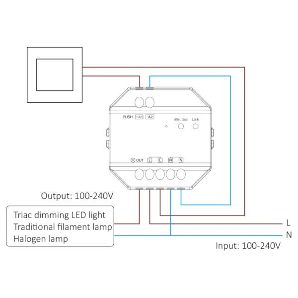 De module werkt met je bestaande pulsschakelaars, zodat je je elektrische installatie niet hoeft aan te passen. Druk kort om te schakelen, houd ingedrukt om te dimmen. Je behoudt tegelijkertijd alle slimme functies via je telefoon. Het instelbare bereik voor minimale helderheid voorkomt dat lampen bij lage standen gaan flikkeren of uitgaan.