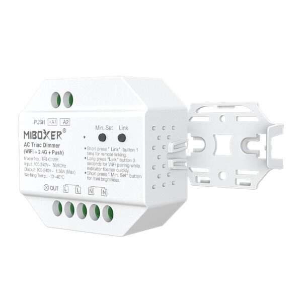 Heb je problemen met flikkerende lampen als je dimt? Werken je huidige dimmers niet goed met LED-verlichting? Of wil je je verlichting slim maken zonder complexe installaties? De MiBoxer TRI-C1WR dimmodule biedt de oplossing. Deze slimme dimmer past in je bestaande inbouwdoos en geeft je volledige controle over je verlichting via je smartphone, spraakassistent, afstandsbediening of pulsschakelaar.