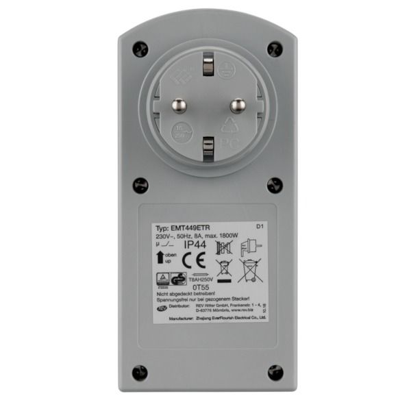 Het LCD-scherm toont alle instellingen en de huidige tijd duidelijk. Met IP44-bescherming is de klok bestand tegen spatwater en stof. Het maximale schakelvermogen is 1.800 Watt, geschikt voor de meeste tuinapparaten. De afmetingen zijn compact: 135 x 64 x 90 mm.