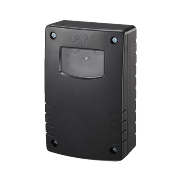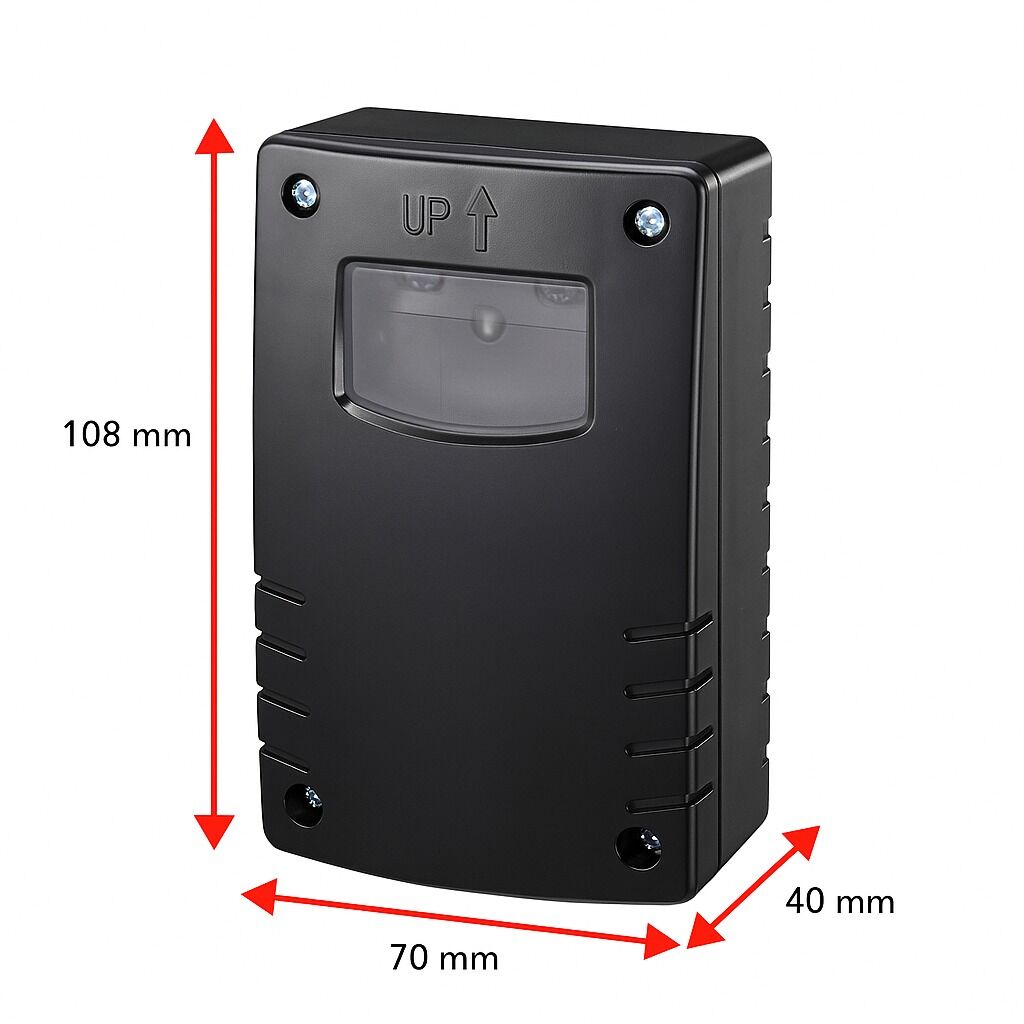 De IP44-behuizing is spatwaterdicht en stofbestendig. Dankzij het temperatuurbereik van -20°C tot 40°C functioneert de schakelaar ook bij extreme weersomstandigheden. De zwarte uitvoering past naadloos bij moderne gevels en donkere oppervlakken.