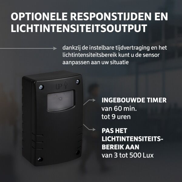 Na montage stel je de gewenste lichtsterkte en timerduur in. Daarna doet de schakelaar zijn werk volautomatisch — zonder gedoe of onderhoud.
