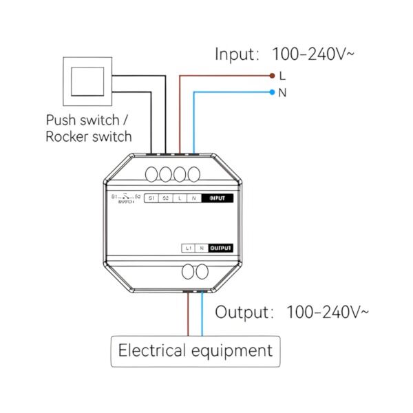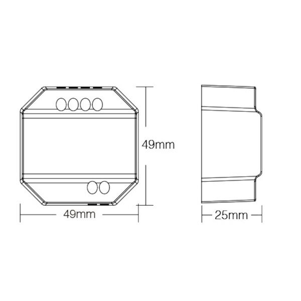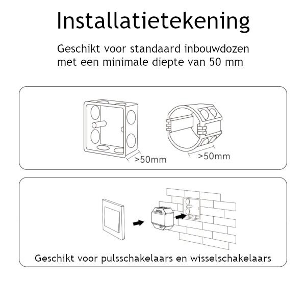 De compacte afmetingen (49x49x25mm) maken dat de module in bijna elke standaard inbouwdoos past. Je hebt wel een nuldraad (blauwe N-draad) nodig bij de schakelaar voor een correcte installatie. De module werkt samen met zowel drukschakelaars als wipschakelaars, wat je flexibiliteit geeft bij de installatie.