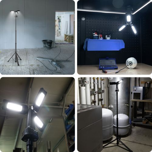 Krachtige LED-werklamp met 7000 lumen, uitschuifbaar statief tot 2 meter, drie verstelbare lichtmodules, spatwaterdicht (IPX4), drie lichtstanden en een werktijd tot 7 uur.