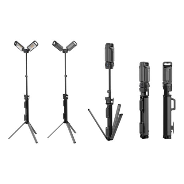Dankzij het compacte, inklapbare ontwerp is deze werklamp eenvoudig te vervoeren. Uitgerust met geïntegreerde, uitklapbare voeten en een telescopisch statief voor optimale stabiliteit. De kabel kan netjes worden opgeborgen in de basis, en op ruwe ondergronden zijn de grondpennen in de voeten bijzonder handig.