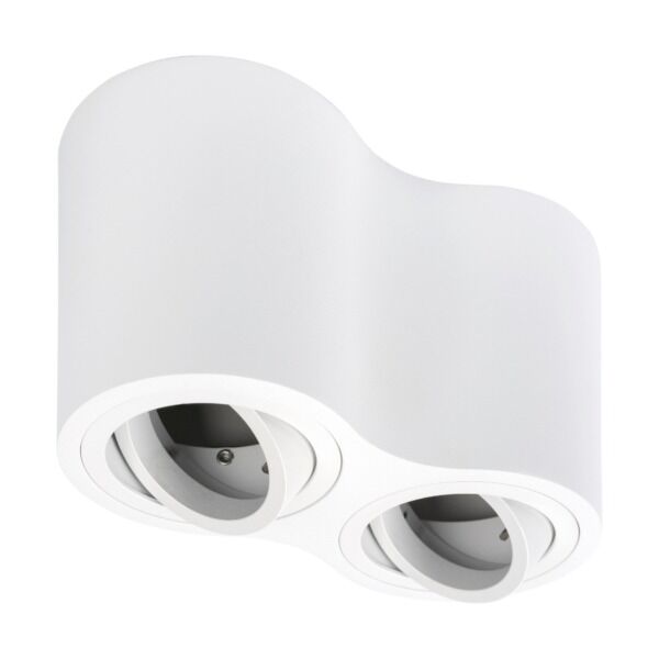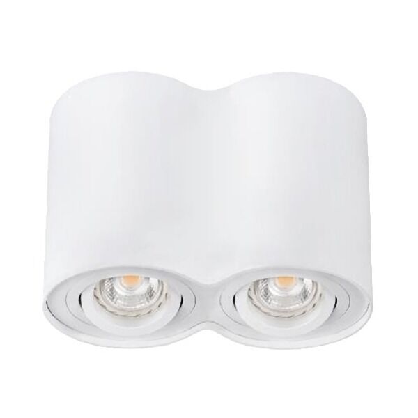 Witte dubbele opbouwspot met kantelbare lampen (25°) en een 360° draaibare binnenring. Modern design met anti-verblinding. Geschikt voor twee lampen met GU10-fitting. Gemakkelijke installatie en lampvervanging van onderaf.